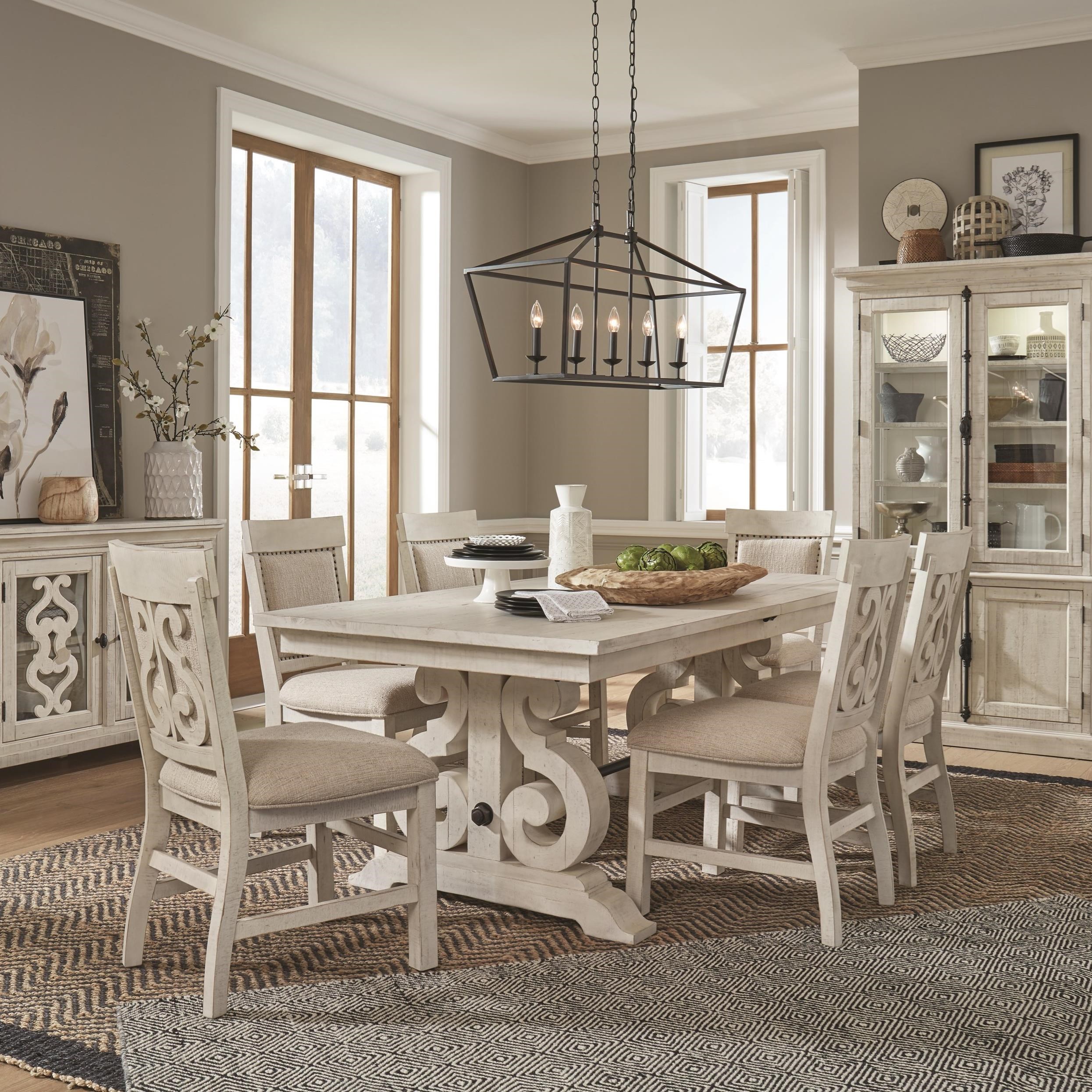Magnussen Home Bronwyn 7-Piece Farmhouse Dining Table Set ... from images.furnituredealer.net Farmhouse dining table for 6: Not only does this multipurpose table have a good chunk of table space, 2 matching stools, and a sleek wood. The paper veneer table top and seats feature grained details and a light hue, giving this piece its farmhouse appeal, and contrasts its sleek black base. You can find rustic wood farm home dining table sets that would work great in a farmhouse dining area. We built a farmhouse dining table, and if you'd told me that a year ago, i'm not sure i would have believed you. The farmhouse dining tables and counter tables in our dining sets create a relaxing atmosphere with a sleek plank table top and plenty of legroom with a farmhouse outdoor dining set you can rely on superior quality and durability for years to come. We researched the best options to add to your dining room. Farmhouse dining table set with storage: